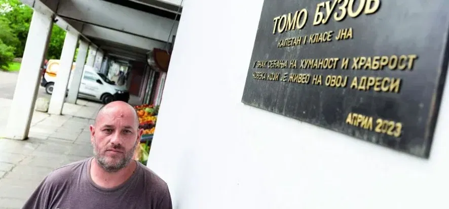 ДАРКО БУЗОВ Синот на убиениот Тома од филмот на Слијепчевиќ пред плочата за татко му подигната од состанарите, која е неколку пати уништувана