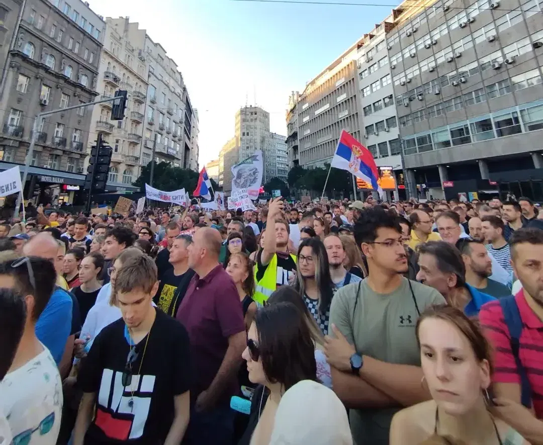 – Самиот собир на Теразије беше мирен и полицијата процени дека имало меѓу 24 и 27 илјади луѓе, но по митингот организаторите постапија спротивно на се што напишаа во пријавата за јавниот собир, го нарушија јавниот ред и мир и го блокираа меѓународниот сообраќај, со што ја загрозија безбедноста на граѓаните, се наведува во соопштението.