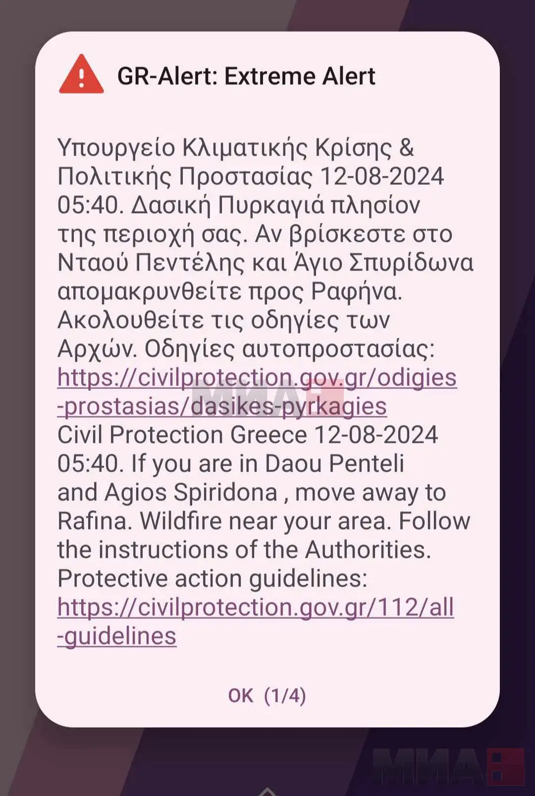-Ветровите во текот на ноќта останаа силни, создавајќи опасни услови. За жал, нивниот интензитет се очекува да се зголеми во следните неколку часа и граѓаните од подрачјата каде што се развива пожарот во секој случај треба да ги следат инструкциите на надлежните, посочи Ватракојанис.
