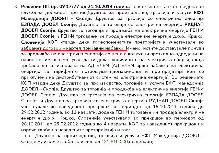 Таа истакна дека „во 2014 година, во време на ВМРО-ДПМНЕ, Комисијата за заштита на конкуренцијата повела постапка за забранет договор – картел при јавни набавки и донела решение за казни“.