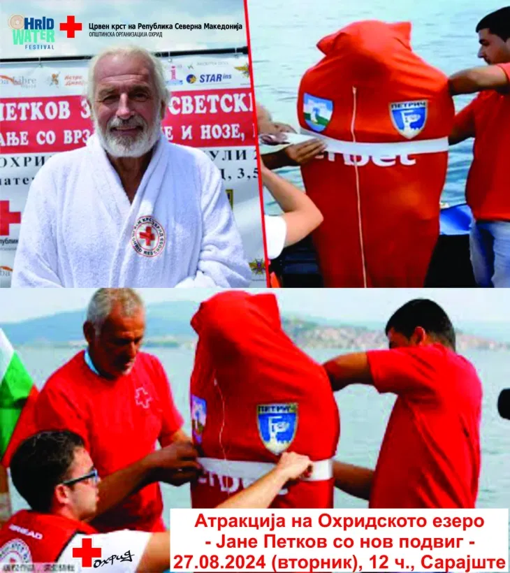 Инаку, овој интересен обид е втор настан што Општинската организација на Црвениот крст од Охрид го организира со Јане Петков. Првиот настан беше организиран во септември 2013 година, кога за гинисов рекорд Петков на Охридското Езеро преплива повеќе од два километри целосно врзан во вреќа.