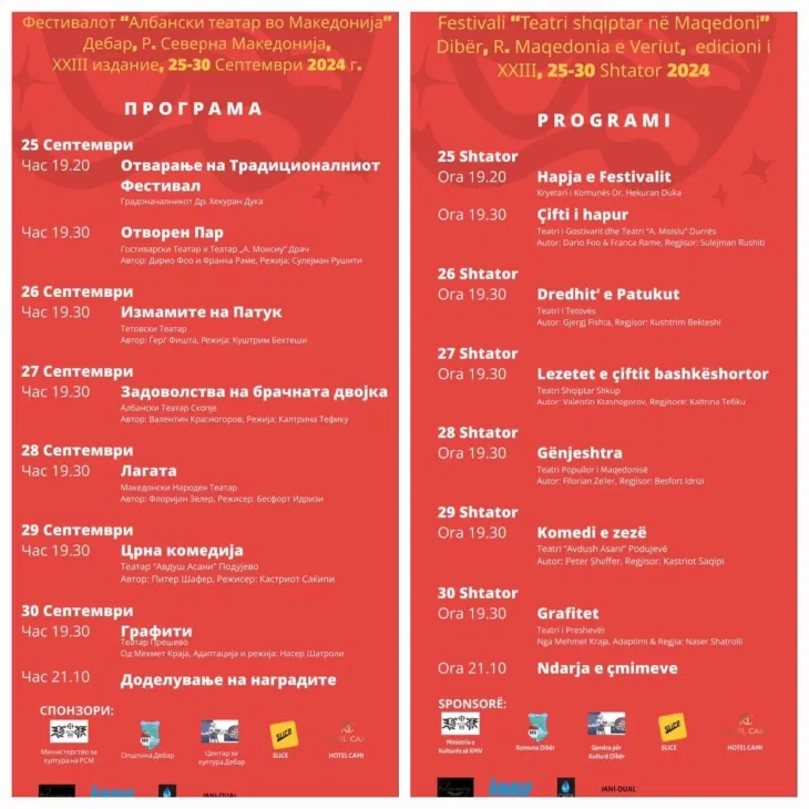 – Годинешното 23. издание на фестивалот свечено ќе го отвори градоначалникот Хекуран Дука а следните денови, до 30 септември кога завршува, пред дебарската публика ќе се претстават театарски куќи од Скопје, Тетово, Гостивар, Драч, Подујево и Прешево. На последната фестивалска вечер ќе биде изведена претставата „Графити“ од Мехмет Краја во изведба на театарот од Прешево, по што ќе бидат доделени наградите за најдобра претстава, режија, актер и актерка, рече за МИА, директорот на фестивалот Илбер Нуредини.