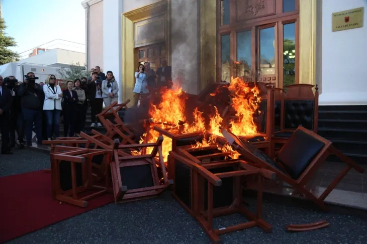 Демократите ги извадоа столчињата на кои седат во салата, пред собраниската зграда, ги полеаја со бензин и ги запалија.