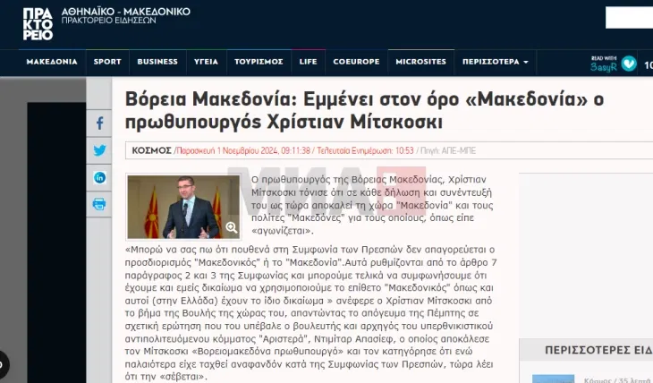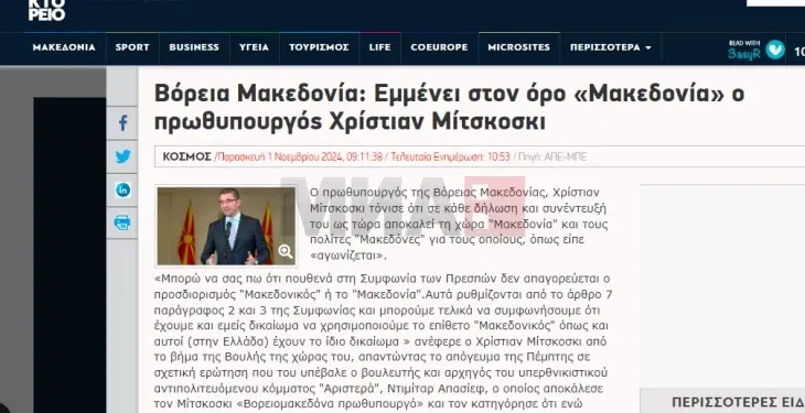Ставовите на премиерот Христијан Мицкоски за употребата на придавката „македонски“ и терминот „Македонија“, изразени на вчерашната собраниска седница посветена на пратенички прашања, се најдоа во дел од онлајн изданијата на грчките медиуми, кои го пренесуваат текстот од државната новинска агенција АНА-МПА под наслов „Северна Македонија: Премиерот Мицкоски инсистира на терминот Македонија“, јави дописничката на МИА од Атина.