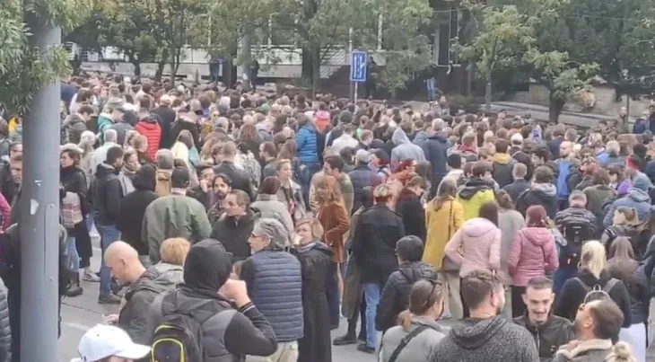 Дел од насобраните активисти, кои претходно се собраа на протестот кај старата железничка станица поради трагедијата во Нови Сад, имаат обоени ракавици во црвено, носат транспаренти „рацете ви се крвави“- како порака до властите, а во исто време извикуваат „оставка“, пренесува Бета.