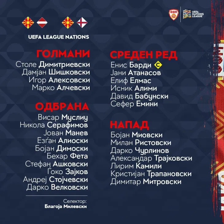 Селекторот на македонската фудбалска репрезентација, Благоја Милевски го објави списокот со повикани фудбалери за натпреварите против Летонија (14 ноември) и против Фарски Острови (17 ноември) од Лига на Нации. Двата меча ќе се одиграат на Националната арена „Тодор Проески“ во Скопје.