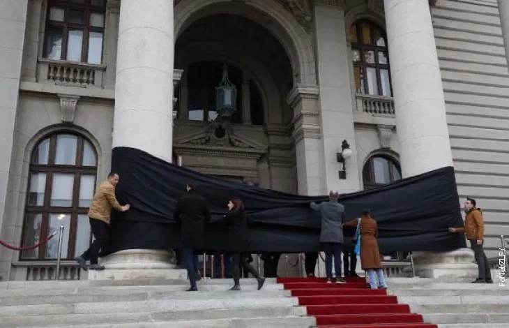Пратениците на парламентарната опозиција на Собранието на Србија им се придружија на Новосаѓани, кои пред зградата на Парламентот во Белград развија црно знаме и 14 минути молчејќи стоеја на улица.