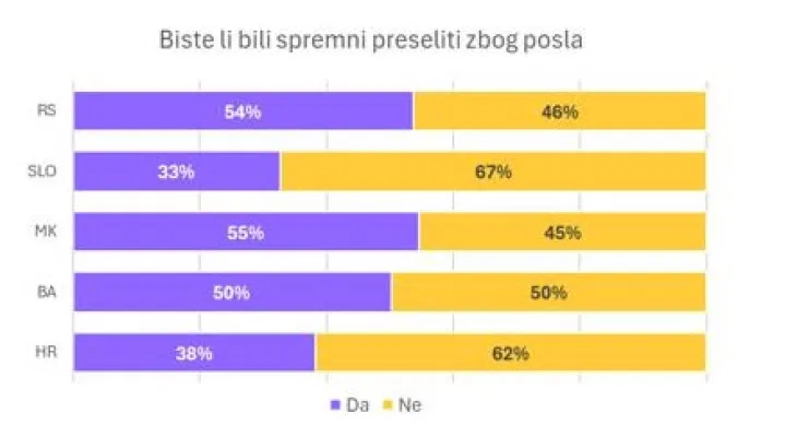Работниците од Северна Македонија (55%) и Србија (54%) се најподготвени да се преселат заради работа, додека испитаниците од Словенија (33%) и Хрватска (38%) се нешто порезервирани.