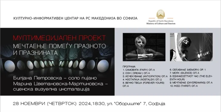 Во галеријата на Културно-информативен центар на Република Северна Македонија во Софија, вечер, во 18:30 часот ќе се одржи мултимедијалниот проект „Мечтаење помеѓу празното и празнината“ – солистички концерт на авторска музика на Билјана Петровска (соло пијано) и сценска визуелна инсталација на Марина Цветановска-Мартиновска.