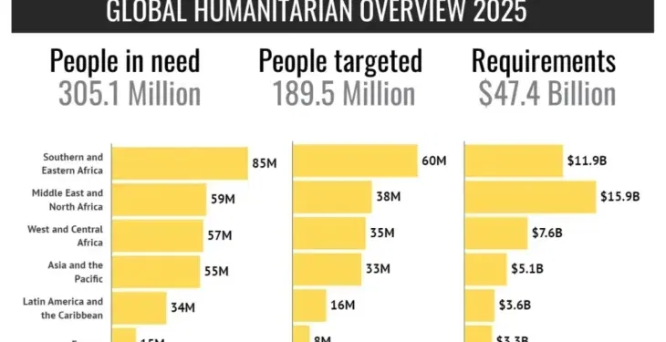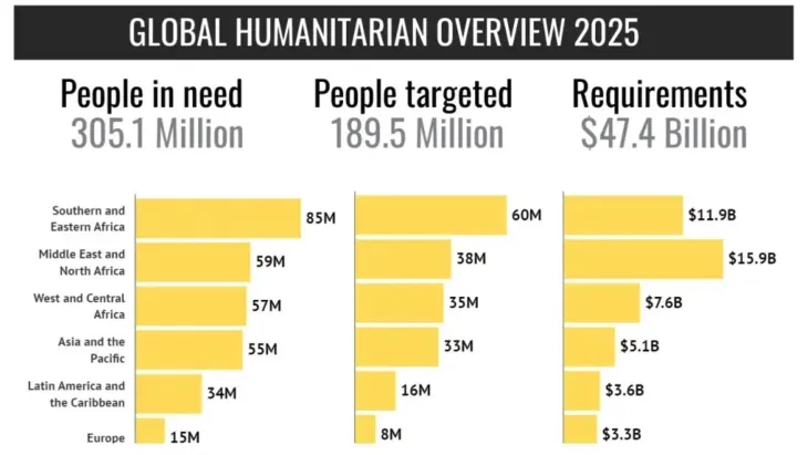 Годишниот апел на агенциите на ОН и другите хуманитарни организации бара 47,4 милијарди долари за 2025 година, малку помалку од апелот за годинава, кои би требало да се доволни за да се обезбеди помош за 189,5 милиони најранливи луѓе.