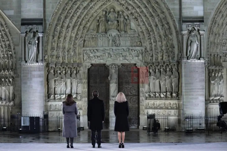 Францускиот претседател Емануел Макрон и неговата сопруга ги пречекаа и се фотографираа со шефови на држави, на влади и познати личности на плоштадот пред Нотр Дам.
