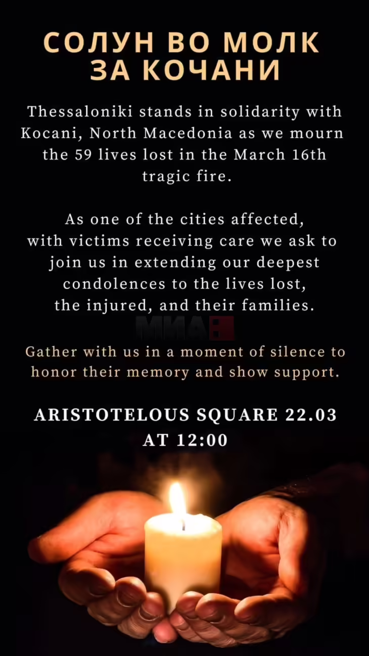 Македонците кои живеат и студираат во Солун, точно напладне организираат собир „Солун во молк за Кочани“ на централниот плоштад „Аристотел“ за да им оддадат почит на жртвите во трагичниот пожар во дискотеката „Пулс“, јави дописничката на МИА од Атина.