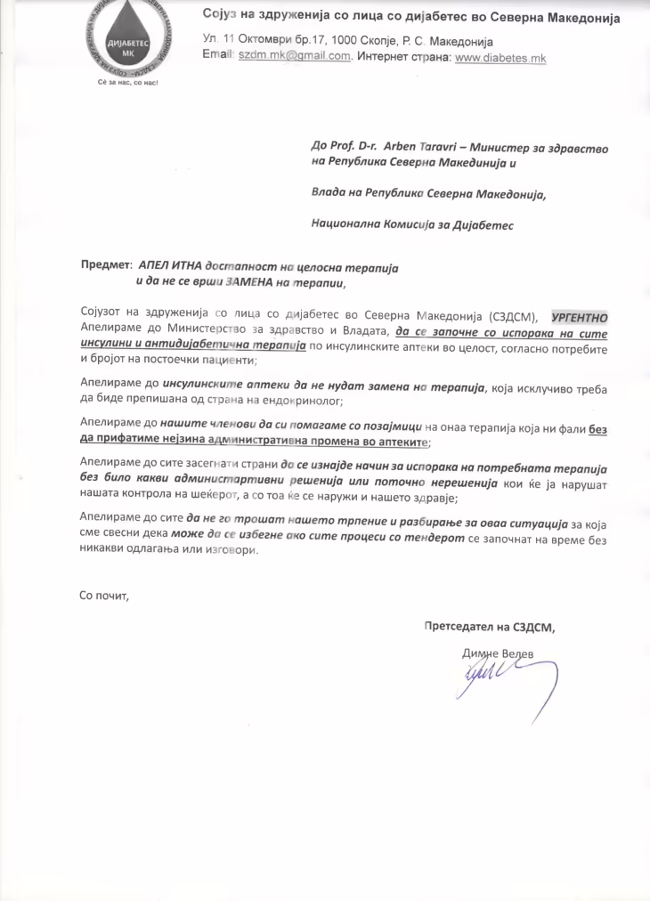 – Апелираме до инсулинските аптеки да не нудат замена на терапија, која исклучиво треба да биде препишана од страна на ендокринолог; Апелираме до нашите членови да си помагаме со позајмици на онаа терапија која ни фали без да прифатиме нејзина административна промена во аптеките; Апелираме до сите засегнати страни да се изнајде начин за испорака на потребната терапија без било какви администартивни решенија или поточно нерешенија кои ќе ја нарушат нашата контрола на шеќерот, а со тоа ќе се наружи и нашето здравје; Апелираме до сите да не го трошат нашето трпение и разбирање за оваа ситуација за која сме свесни дека може да се избегне ако сите процеси со тендерот се започнат на време без никакви одлагања или изговори, се наведува во апелот на Сојузот на здруженија со лица со дијабетес.