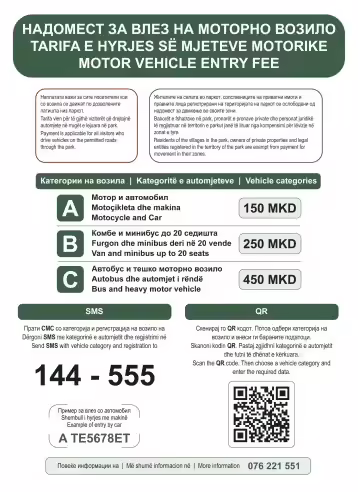 Од 2 мај 2025 година, Јавната установа Национален парк Шар Планина почнува со систем за наплата на влез на моторни возила на територијата на паркот, преку праќање на СМС порака или скенирање на QR код. Треба да платат сите посетители кои со моторни возила се движат по дозволените патишта низ паркот, а ослободени од наплата се жителите на селата. сопствениците на приватни имоти, како и правните лица регистрирани на територијата на НП Шар Планина.