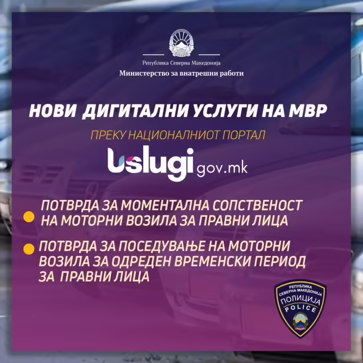 – Преку порталот uslugi.gov.mk пуштени се во функција две нови дигитални услуги и тоа: Потврда за моментална сопственост на моторни возила за правни лица https://uslugi.gov.mk/service/potvrda-za-momentalna-sopstvenost-na-motorni-vozila-za-pravni-lica-5734 и Потврда за поседување на моторни возила за одреден временски период за  правни лица https://uslugi.gov.mk/service/potvrda-za-poseduvanje-na-motorni-vozila-za-odreden-vremenski-period-za-pravni-lica-5736 Министерството целосно ги става во функција своите капацитети со цел дигитализација во иднина на што повеќе услуги за граѓаните, стои во соопштението.