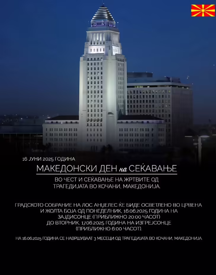 Градското Собрание на Лос Анџелес во американската сојузна држава Калифорнија ќе биде осветлено во црвена и жолта боја, боите на македонското знаме, од вечер во 20:00 часот, до вторник наутро во 6:00 часот, по локално време, во чест и сеќавање на жртвите од трагедијата во Кочани.