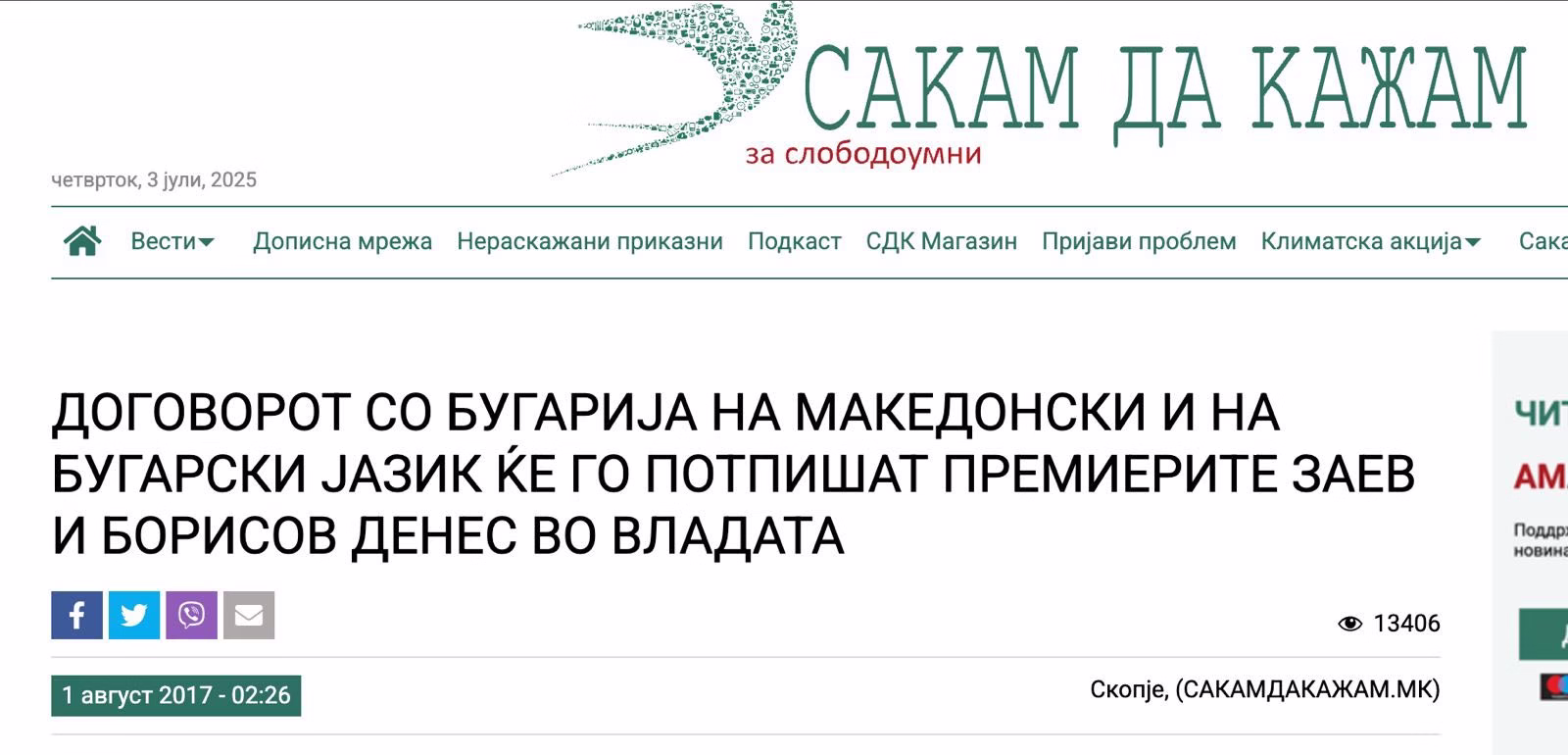 „01.08.2017 – Република Македонија и Република Бугарија потпишаа Договор за добососество на македонски јазик