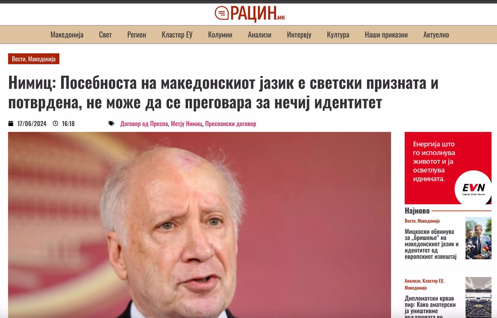 – 17.06.2024 – Нимиц: “Посебноста на македонскиот јазик е светски призната и потврдена, не може да се преговара за нечиј идентитет”, пишува Забрчанец.