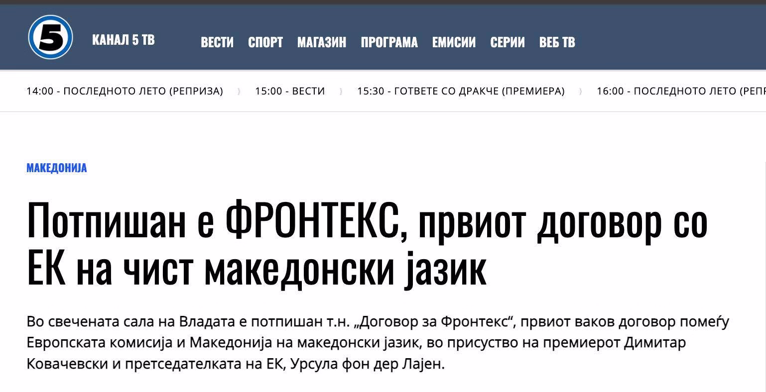 – 17.06.2018 – Република Македонија и Република Грција го потпишаа Договорот од Преспа со кој се потврдува македонскиот јазик и идентитет. Според членот 7 од Договорот, македонскиот идентитет ги отсликува нашата територија, јазик, народ, со сите атрибути, со своја историја, култура и наследство. Според членот 1 (3) од Договорот, официјален јазик на нашата држава е „македонски јазик“ кој е преведлив на сите јазици (на пример, на англиски јазик „Macedonian language“). Без никаква фуснота со дообјаснување. Македонскиот јазик е потврден – идентитетот е зачуван
