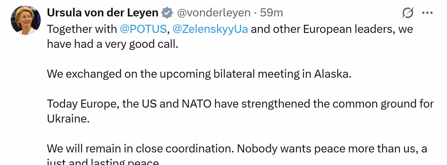 Great call with @POTUS, @ZelenskyyUA & European leaders ahead of President Trump’s meeting with Putin in Alaska. We are united in pushing to end to this terrible war against 🇺🇦 & achieve just and lasting peace. Appreciate @realDonaldTrump leadership & close coordination with…