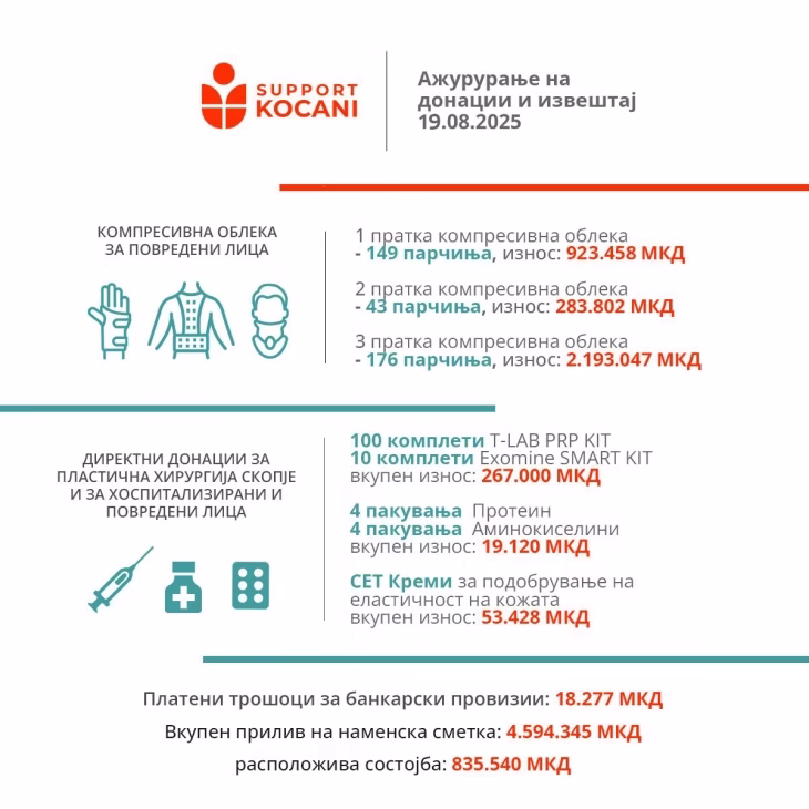 Заклучно со денешниот ден (19 август) вкупниот прилив на наменската сметка изнесува 4.594.345 денари. Од оваа сума реализирани се 3.758.805 денари, за банкарски провизија се потрошени 18. 277 денари, а во моментов на располагање остануваат 835.540 денари, информираат од Граѓанската иницијатива Сапорт Кочани за моменталната состојба со донациите и реализираната помош.