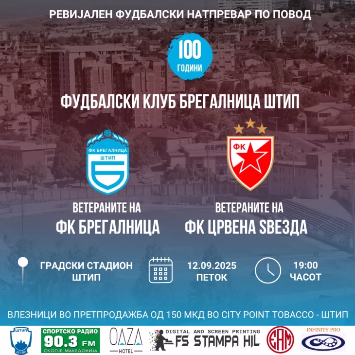 Фудбалскиот клуб Брегалница од Штип слави 100 години постоење. За големиот јубилеј се планира спектакл под рефлектори во градот под Исарот. На 12 септември на Градскиот стадион во Штип ќе се одигра ревијален фудбалски меч меѓу ветераните на штипска Брегалница и ветераните на Црвена ѕвезда.