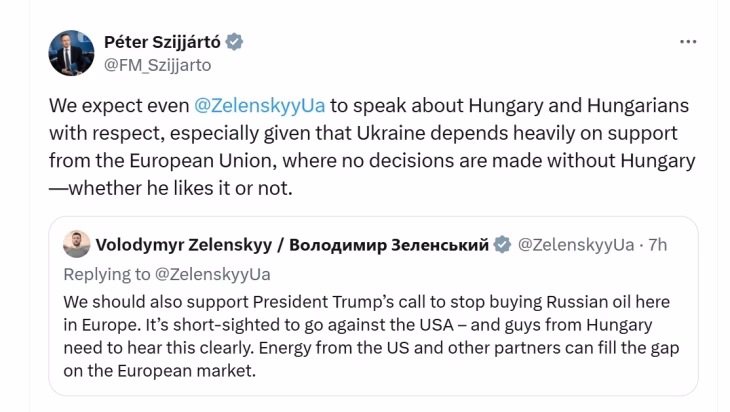 Сијарто на X, одговарајќи на објава на Зеленски, напиша дека се очекува Зеленски да зборува за Унгарија и Унгарците со почит.