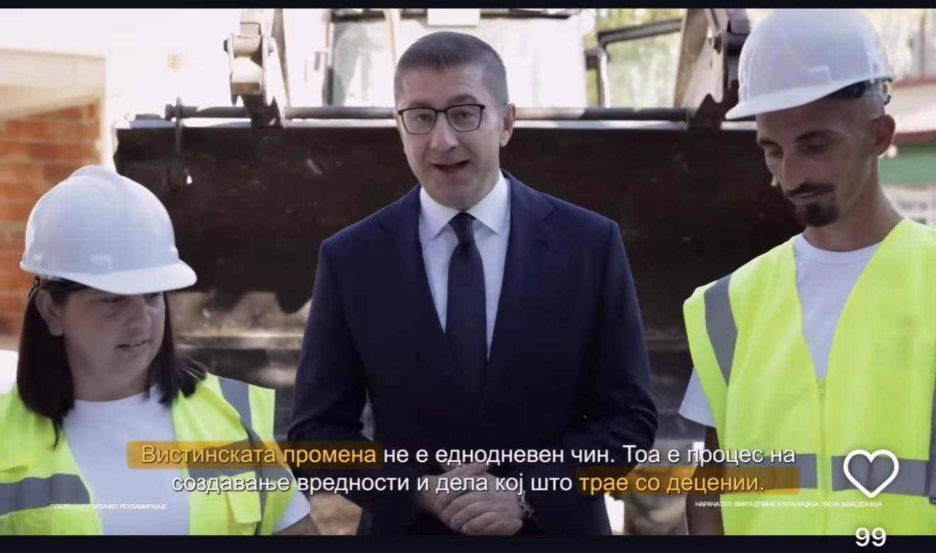 Правдањето зема радикални размери со обраќањето на Мицкоски лично во еден од спотовите во кој вели дека “за вистинската промена биле потребни децении”.