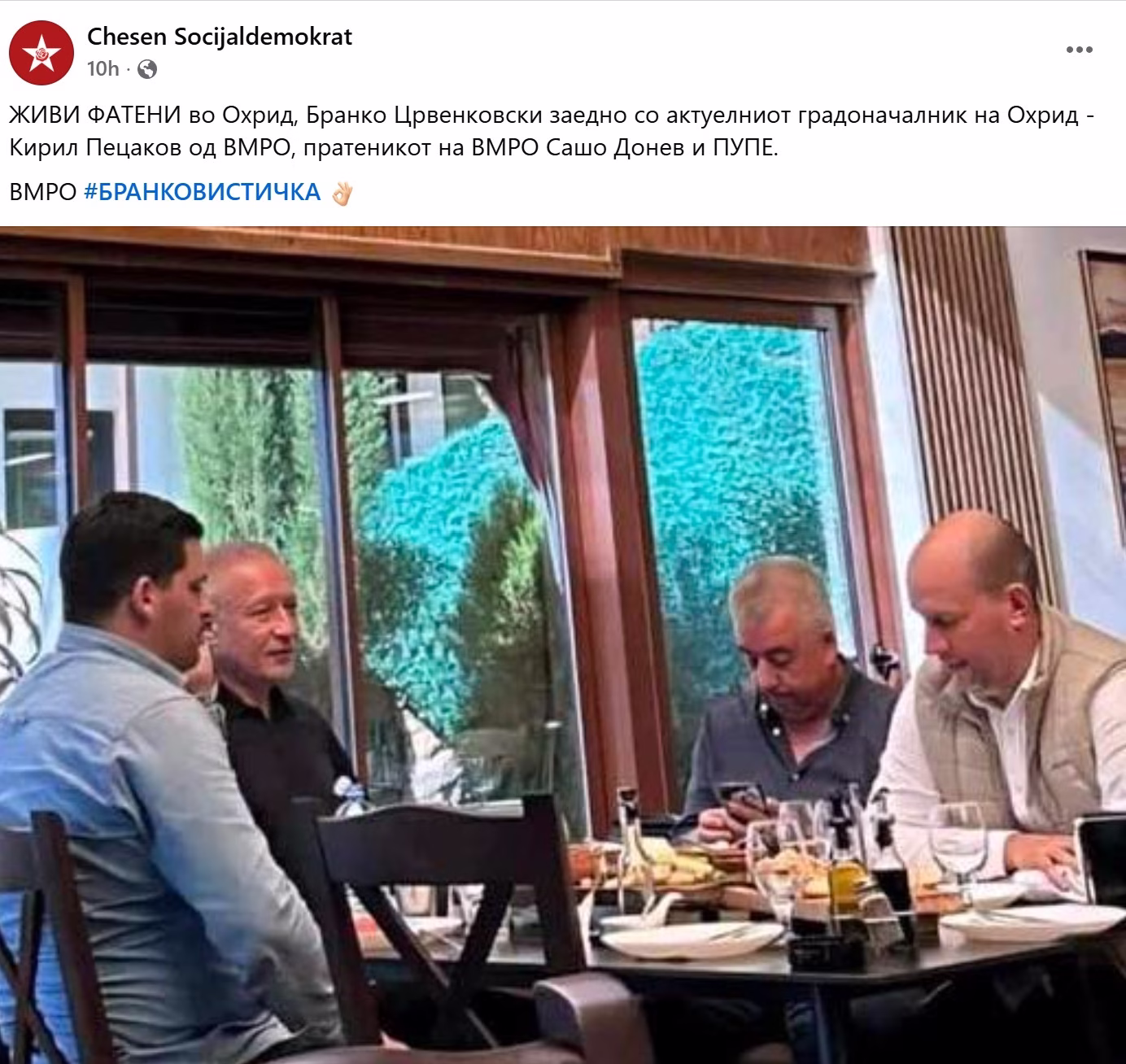 На првата, Црвенковски е во друштво на актуелниот градоначалник Кирил Пецаков од ВМРО-ДПМНЕ, Саше Доневски пратеник од ВМРО-ДПМНЕ, како и Јован Мирчевски – сопственикот на „Пупе Компани“ кој важи за сива еминенција на ЗНАМ во Охрид.