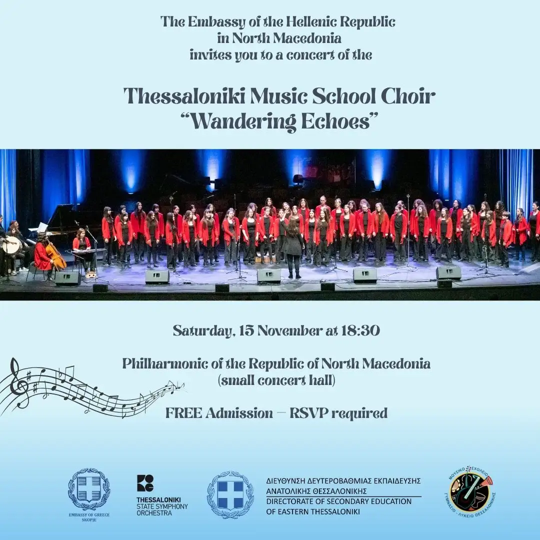 Концертот насловен „Wandering Echoes“ ќе се одржи на 15 ноември во малата сала на Македонската филхармонија, а хорот на Музичкото училиште во Солун ќе настапи со разновидна програма што ќе вклучува широк спектар на песни, од традиционална до модерна музика.