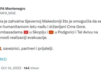 Министерството за надворешни работи на Црна Гора, упати благодарност до Северна Македонија што овозможи евакуација на црногорски државјани од Израел, ...