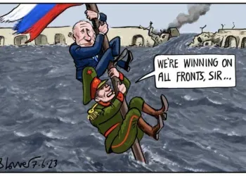 Руски генерал до Путин кај браната Каховка: Победуваме на сите фронтови, господине.... Автор: Patrick Blower / Обединето Кралство. Извор: The ...