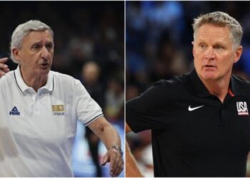 Селекторот на американската кошаркарска репрезентација, Стив Кер по победата над Србија во полуфиналето на кошаркарскиот турнир на Олимпијадата во Париз ...