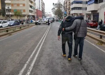 Неформално организирани групи граѓани со палки навечер патролираат во предградието Пејпорт, во Валенсија, погодено од поплавите, за да спречат грабежи ...